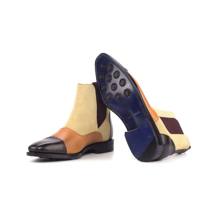 Get these striking multicolored Chelsea boots—handmade from leather and suede—to turn heads.