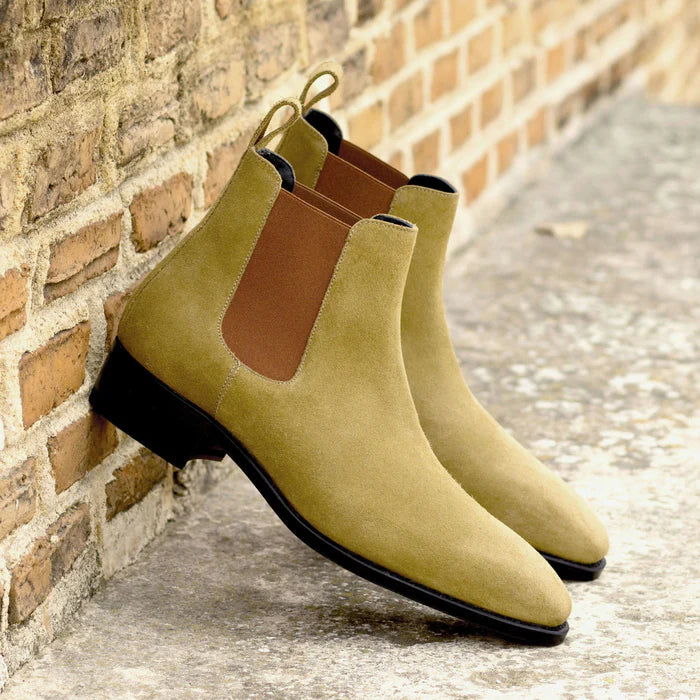 These Chelsea boots with a chisel toe are made by hand from a flexible mustard suede.